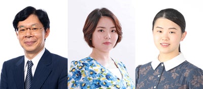 (写真)左から 解説/谷川浩司 十七世名人 聞き手/加藤桃子 女流四段 読み上げ/藤井奈々 女流初段