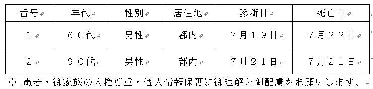 新型コロナウイルスに関連した患者の死亡について business Twitter Facebook はてブ Pocket LINE コピー 2022.07.24 この記事は約1分で読めます。 都内で新型コロナウイルスに感染した方が死亡されましたのでお知らせします。 お亡くなりになった方のご冥福をお祈り申し上げます。