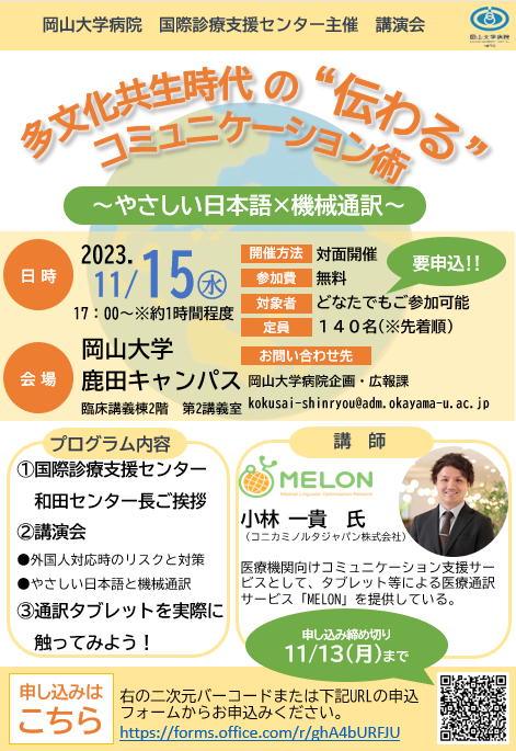 国立大学法人岡山大学(本部:岡山市北区、学長:那須保友)の岡山大学病院国際診療支援センターでは、2023年11月15日(水)17:00~18:00に「多文化共生時代の“伝わる”コミュニケーション術~やさしい日本語×機械通訳~」を本学鹿田キャンパスの臨床講義棟2階第2講義室で開催します。