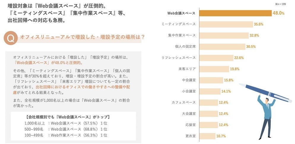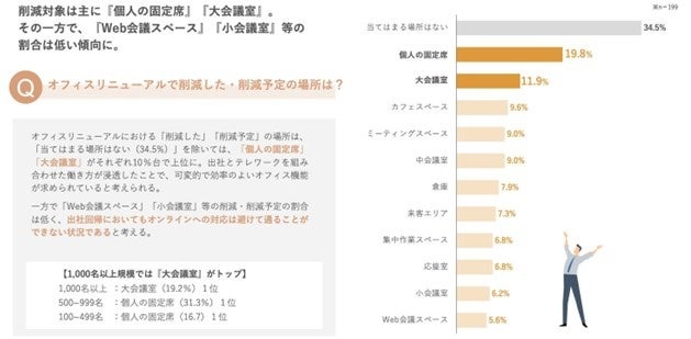 オフィスリニューアルによる増設場所は、「Web会議スペース」が48.0%と最も多く、約半数の企業が増設を実施済み・実施予定という結果になりました。一方で、削減場所では「個人の固定席」が19.8%、次いで「大会議室」が11.9%となりました。出社とテレワークを組み合わせた働き方が浸透したことで、可変的で効率のよいオフィス機能が求められていることがうかがえます。
