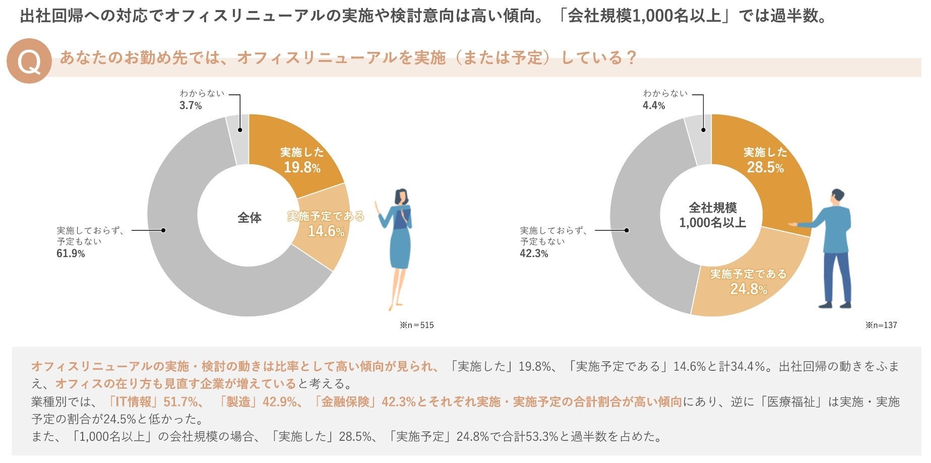 オフィスリニューアルの実施状況については、大企業(全社規模1,000名以上の企業)で「実施した」が28.5%、「実施予定である」が24.8%となり、合計は53.3%となりました。ハイブリッドワークの普及や出社回帰の動きから、オフィスリニューアルへの意向が高いことがうかがえます。