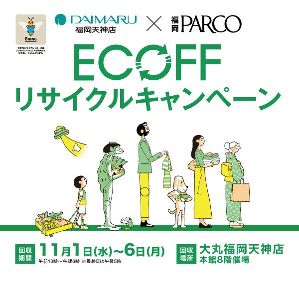 大丸松坂屋で始まった活動「ECOFF」と福岡PARCOの共同プロジェクト。お客様から回収した衣料品・靴・バッグなどを、燃料をはじめとした各種資源にリサイクルをいたします。