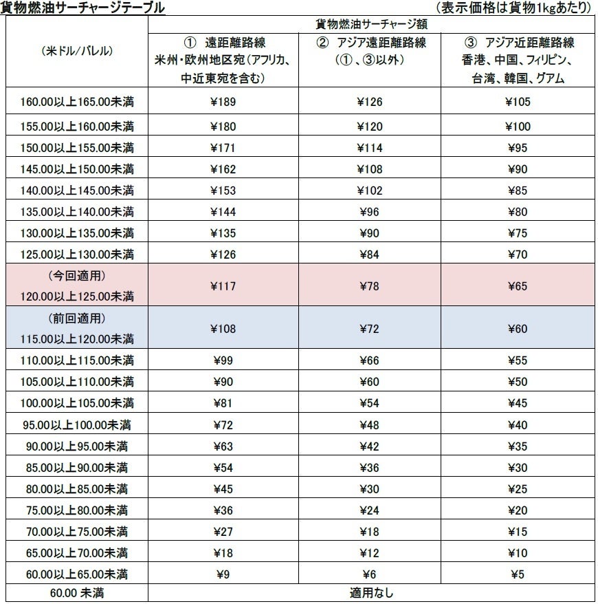 JALは日本発国際貨物燃油サーチャージの改定時期を年12回(毎月)としており、また、各月の貨物燃油サーチャージ額は「シンガポールで取り引きされるジェット燃油(ケロシン)価格の前々月の平均値」を燃油指標価格として、2022年4月より導入した以下テーブルに従いサーチャージ額を決定します。