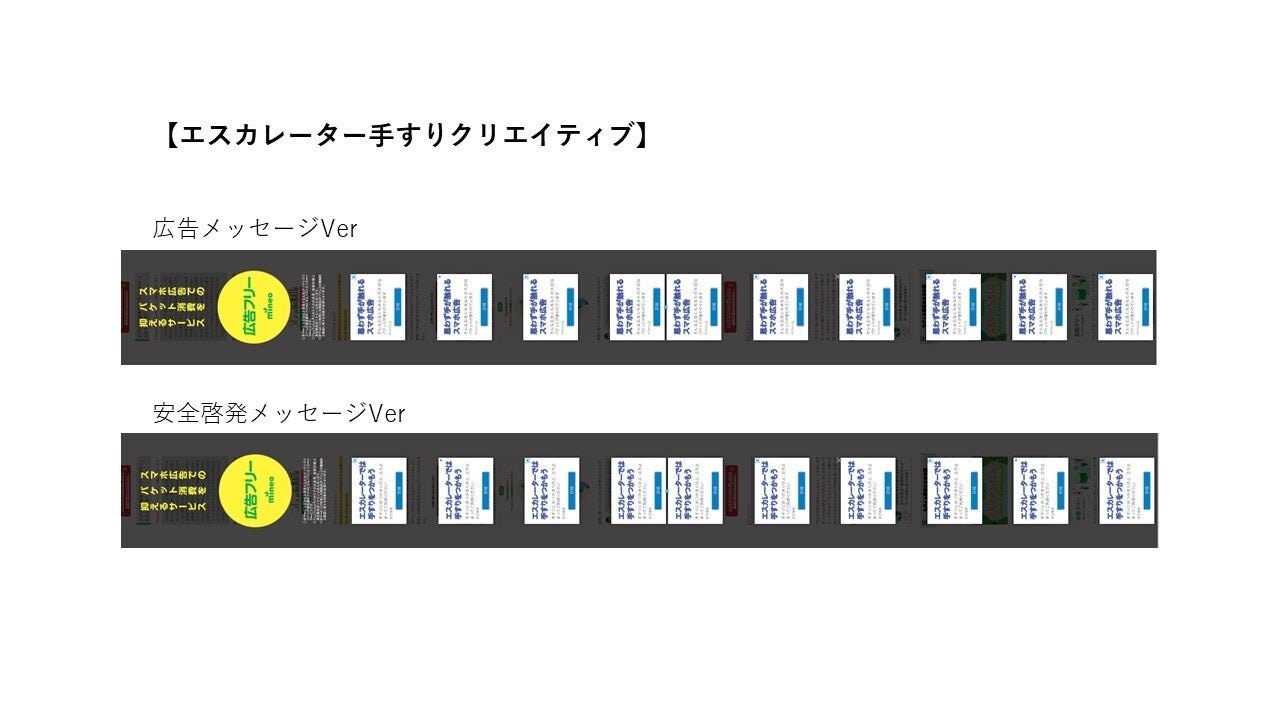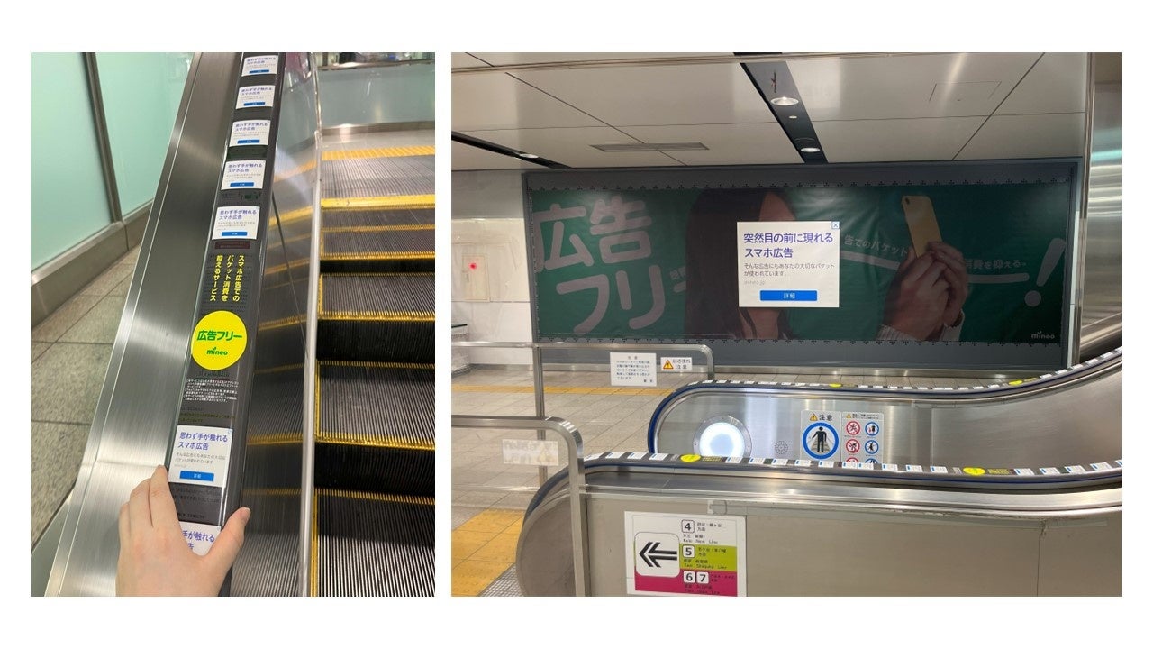 今回は、株式会社オプテージ(本社:大阪府大阪市、代表取締役:名部 正彦)が提供する携帯電話サービス「mineo(マイネオ)」の広告デザインが施されています。「無意識に手が触れる媒体」であるエスカレーター手すりを活用することで、インターネット広告による通信量の消費を抑えることのできる「広告フリー」というサービスの認知拡大につなげています。