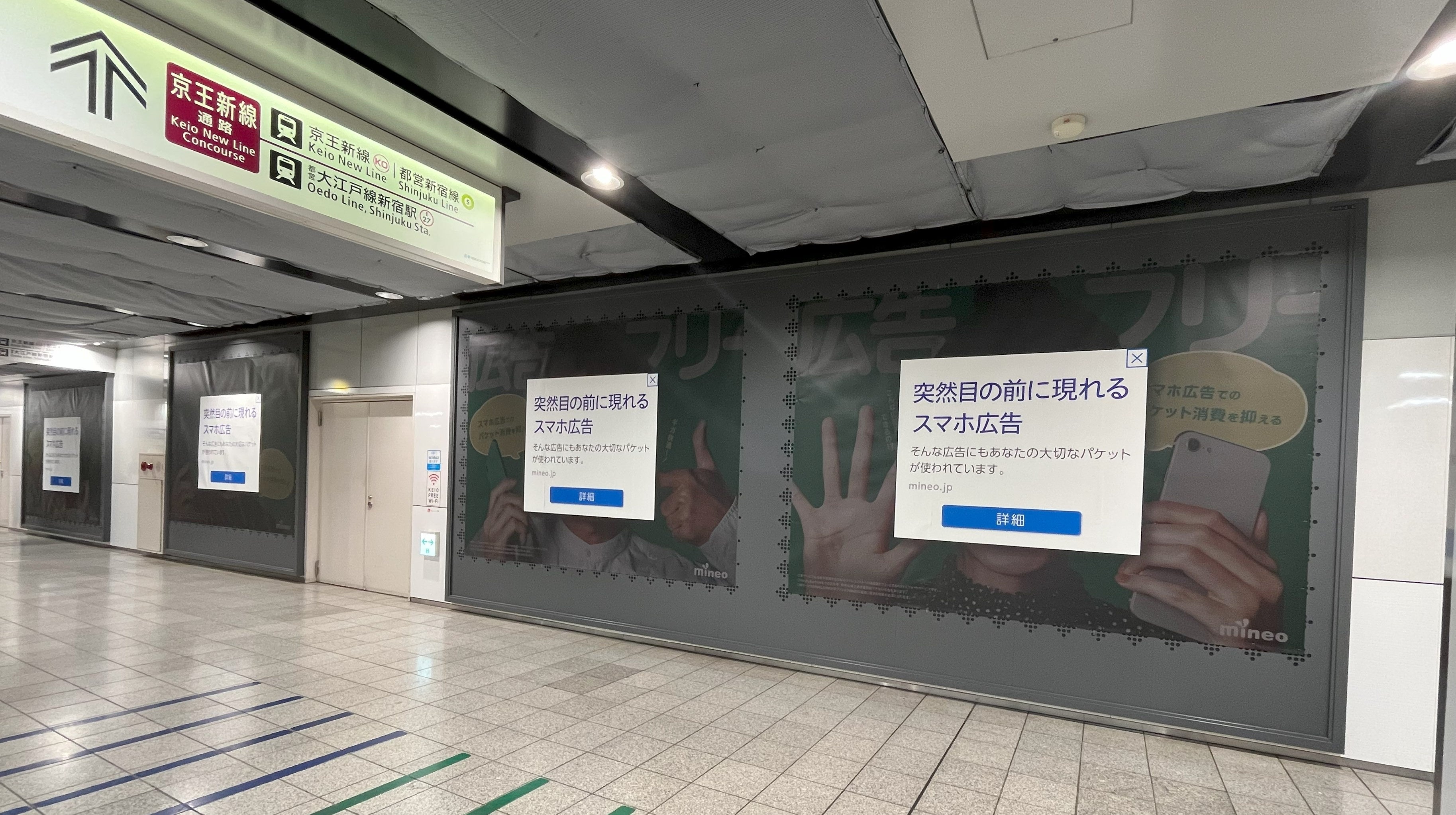 エスカレーターそばに設置された9枚のポスターと手すり広告には、携帯電話の画面上に突如現れる広告を模したデザインを施しています。無意識にタップしてしまう「インターネット広告」が無数に現れる世界観を演出し、そんなインターネット広告によってデータ通信量が気がつかないうちに消費されているという事実を印象付け、「広告フリー」のサービスを訴求したものです。