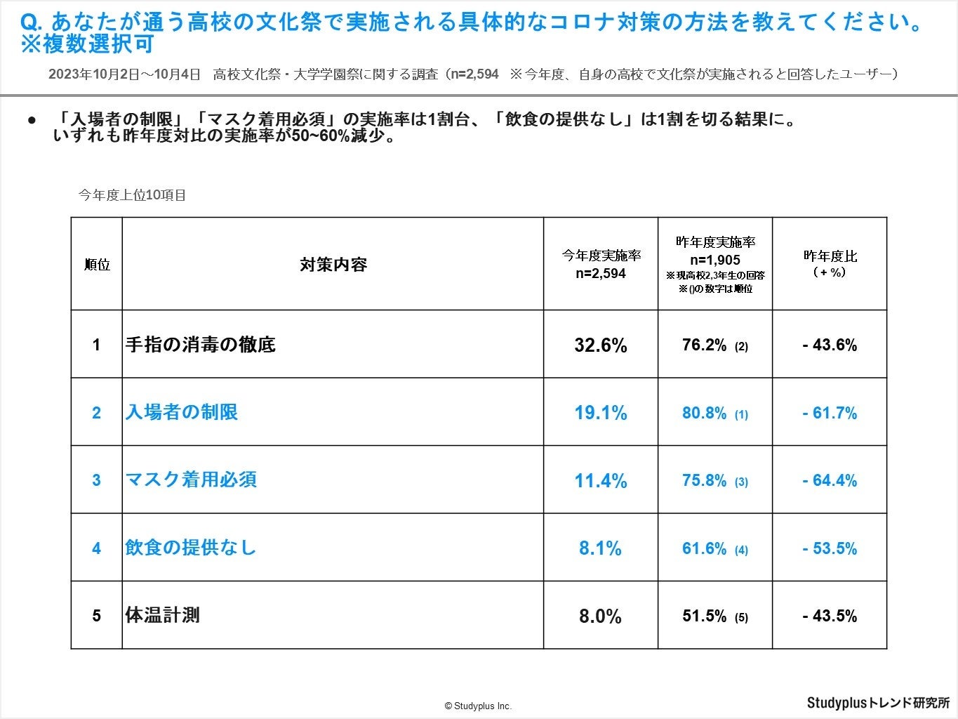 実施していた高校の対策内容を見ても手指の消毒が主となっており、入場者数制限やマスク着用は実施率が大きく下がっています。