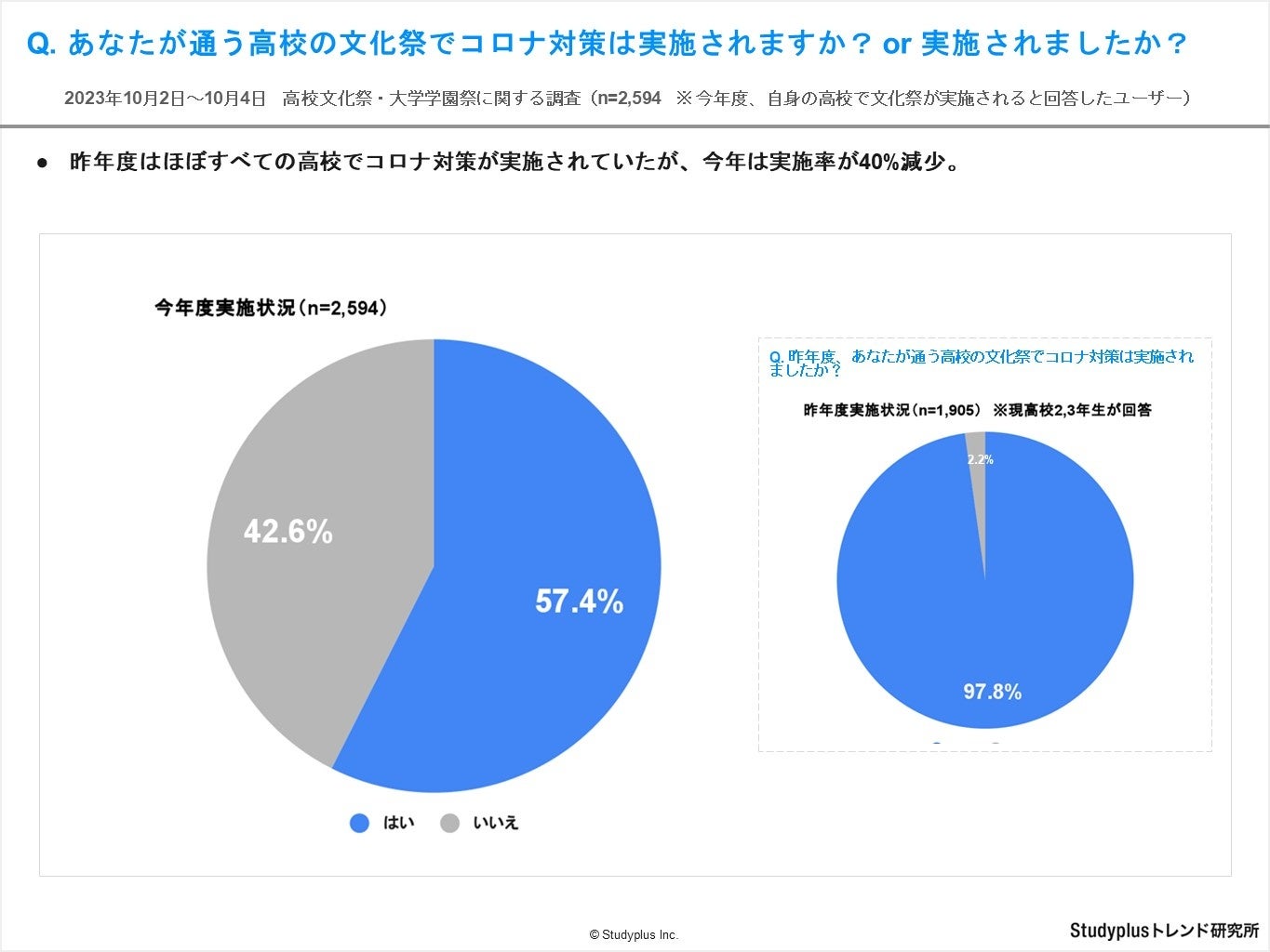 昨年度ほぼ100%の高校で行われていたコロナ対策は、今年は57.4%まで実施率が減少。