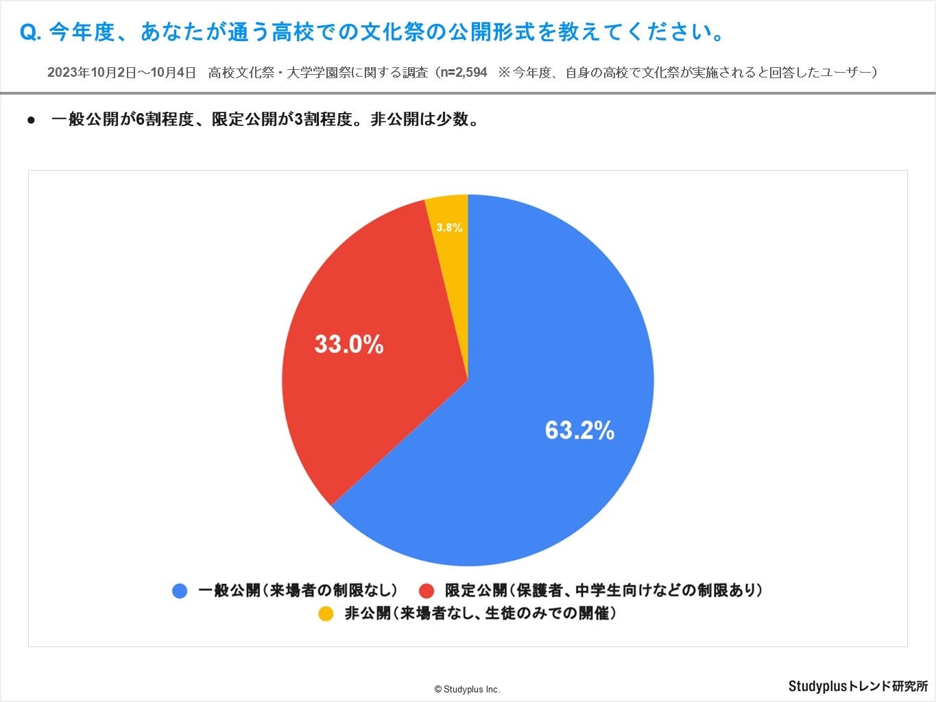 今年度の高校文化祭実施率は、ほぼ100%。公開形式は一般公開6割、限定公開3割。 |