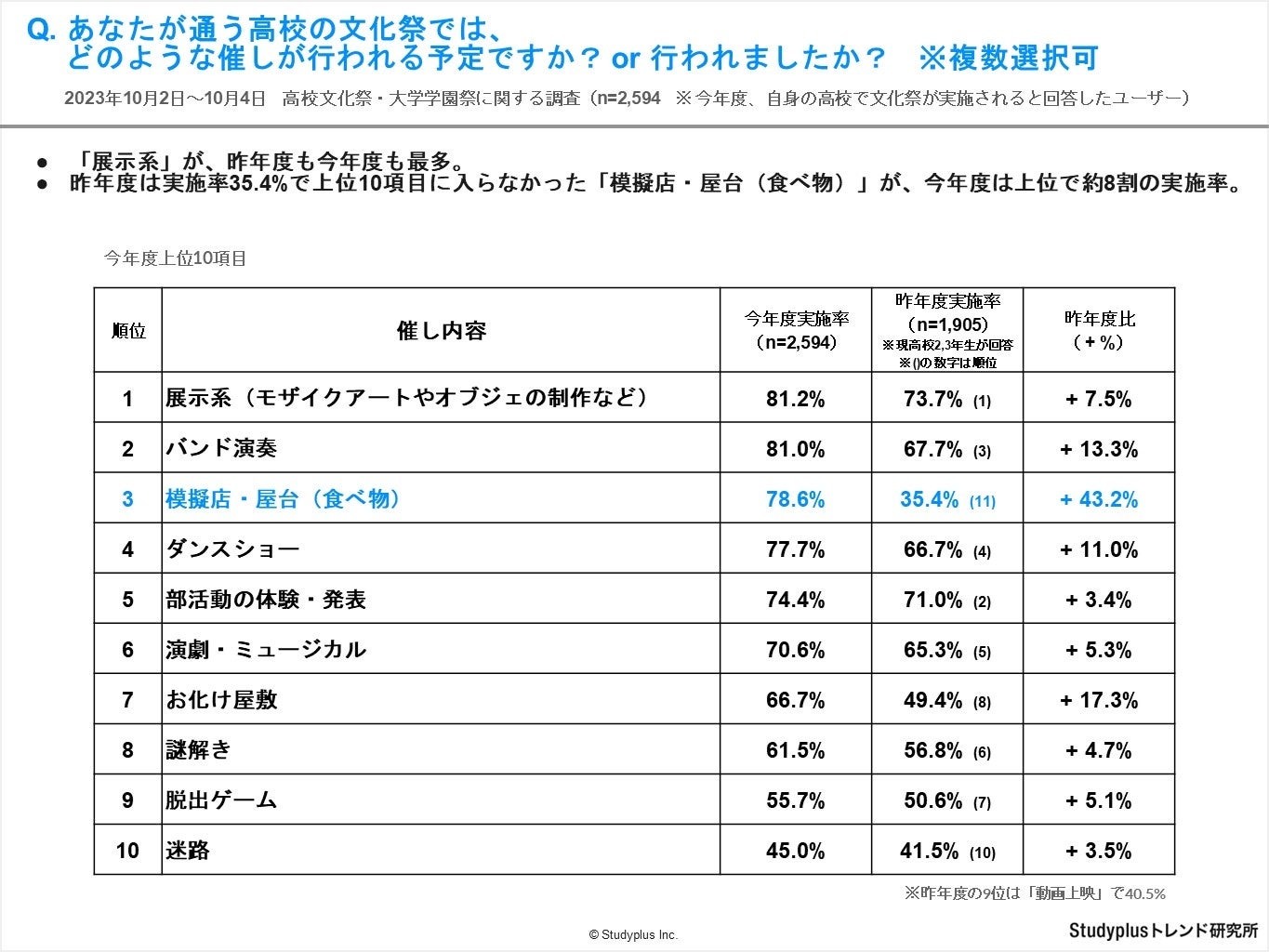 ・昨年度は実施率35.4%で上位10項目に入らなかった「模擬店・屋台(食べ物)」が、今年度は上位で約8割の実施率。