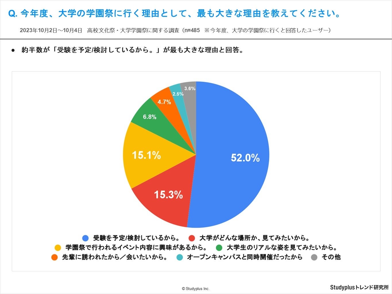 学園祭に参加すると回答した高校生は2割程度。その中で最も多かった理由は、受験を予定している大学の雰囲気を知るために足を運ぶ、という内容でした。