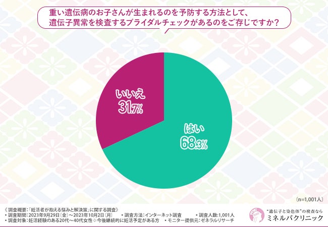 「重い遺伝病のお子さんが生まれるのを予防する方法として、遺伝子異常を検査するブライダルチェックがあるのをご存じですか?」と質問したところ、『はい(68.3%)』『いいえ(31.7%)』という回答結果になりました。