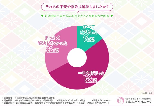 では、「それらの不安や悩みは解決しましたか?」と質問したところ、『すべて解決した(14.8%)』『一部解決した(52.6%)』『まったく解決しなかった(32.6%)』という回答結果になりました。
