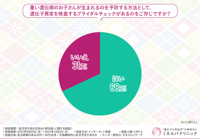 「重い遺伝病のお子さんが生まれるのを予防する方法として、遺伝子異常を検査するブライダルチェックがあるのをご存じですか?」と質問したところ、『はい(68.3%)』『いいえ(31.7%)』という回答結果になりました。