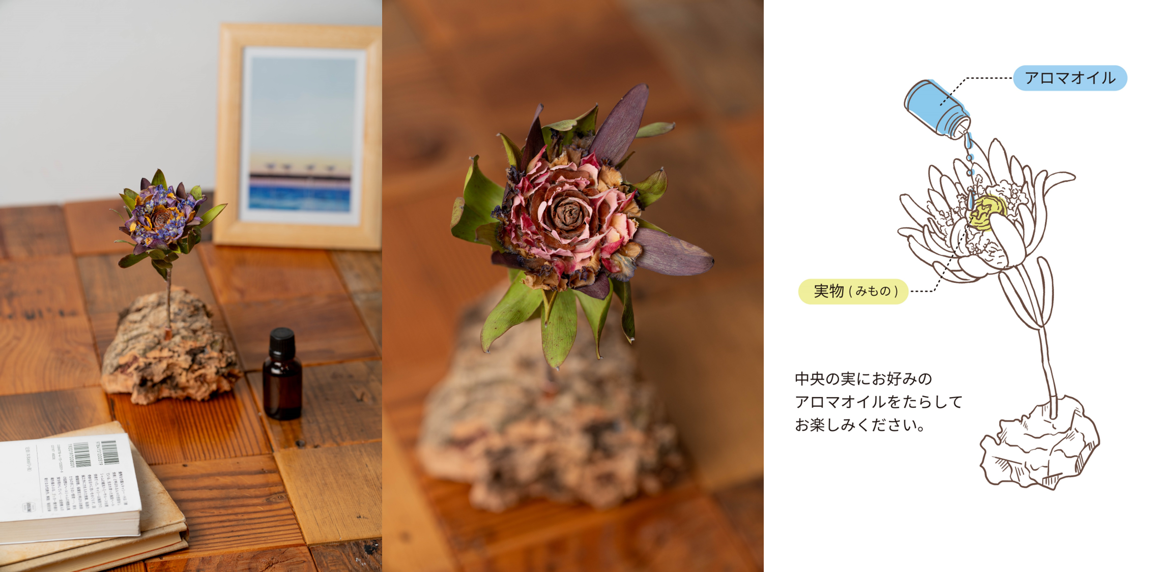 花の種類だけでなく、規格外や店舗廃棄花材、剪定ゴミといった、それぞれの置かれた環境や物語が異なる花材を集め、この世には存在しない一輪の花として構築。湿気に弱いドライフラワーですが、アロマオイルを滴下する受口に実物(みもの)を活用することでデュフューザーとして利用できる仕様にしました。