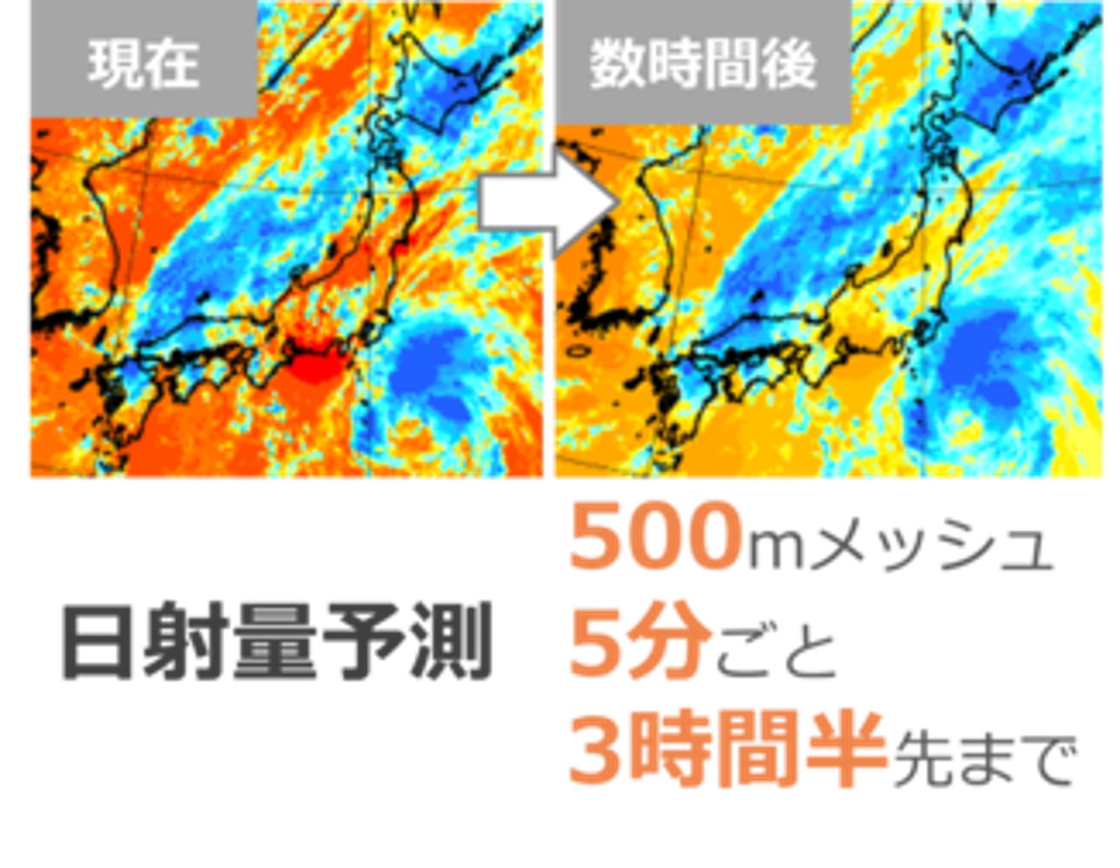 500mメッシュ・5分毎・3時間半先までの日射量予測を提供します。太陽光パネルの設備情報をご提示いただくことで、発電量まで変換した状態で提供可能です。