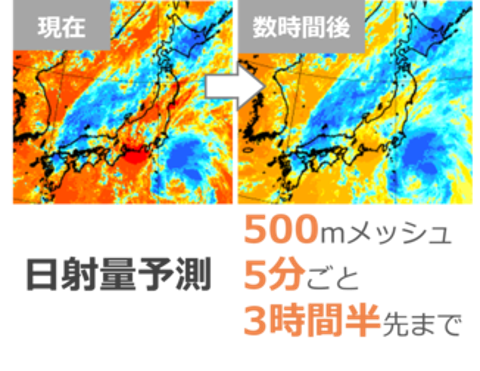 500mメッシュ・5分毎・3時間半先までの日射量予測を提供します。太陽光パネルの設備情報をご提示いただくことで、発電量まで変換した状態で提供可能です。