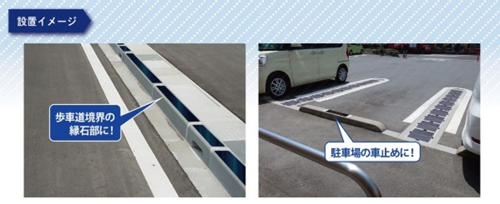 歩車道境界の縁石部や駐車場の車止め部など、縁石を有効活用し、さまざまな場所で太陽光発電が実現できる他にはないスマートな発電設備をご提案します。