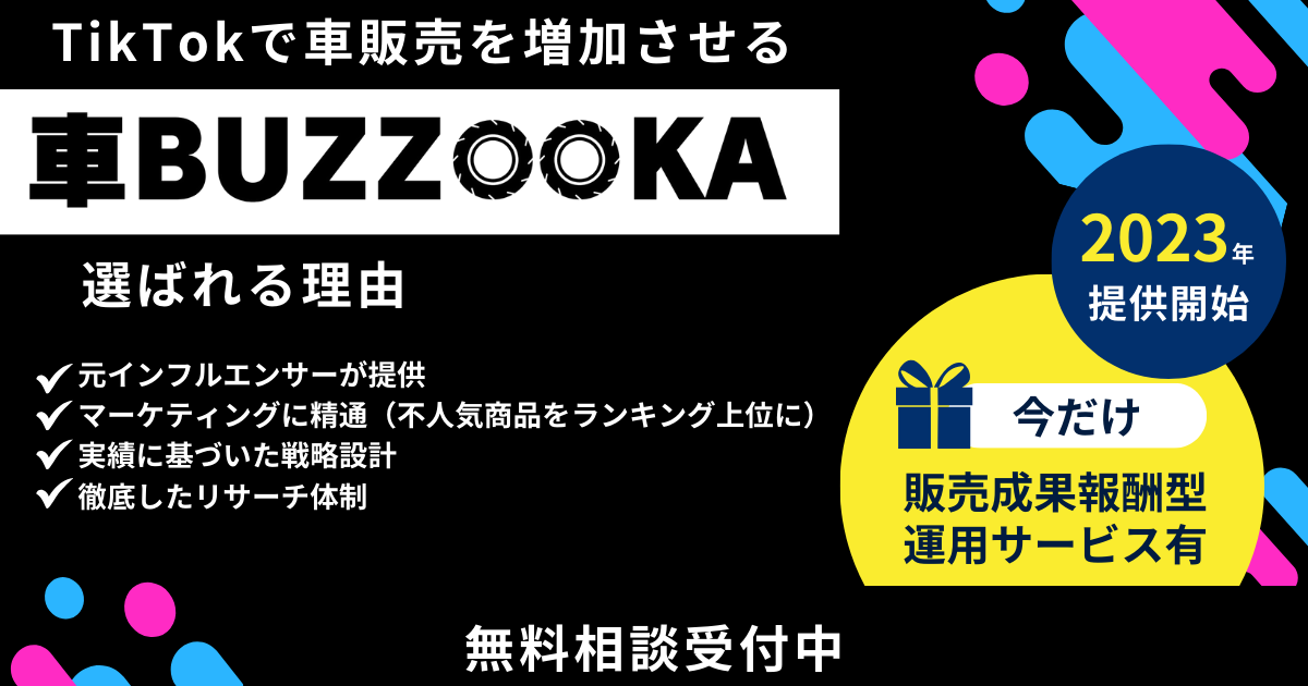 当社の提供するTikTok運用コンサルティングサービス「BUZZOOKA」では認知・ブランディング・採用・商品販売の目的に合わせて、各企業ごとにマッチする運用を提供しております。今回そのサービスの中でも車販売に特化した販売戦略を「車BUZZOOKA」として提供開始いたしました。