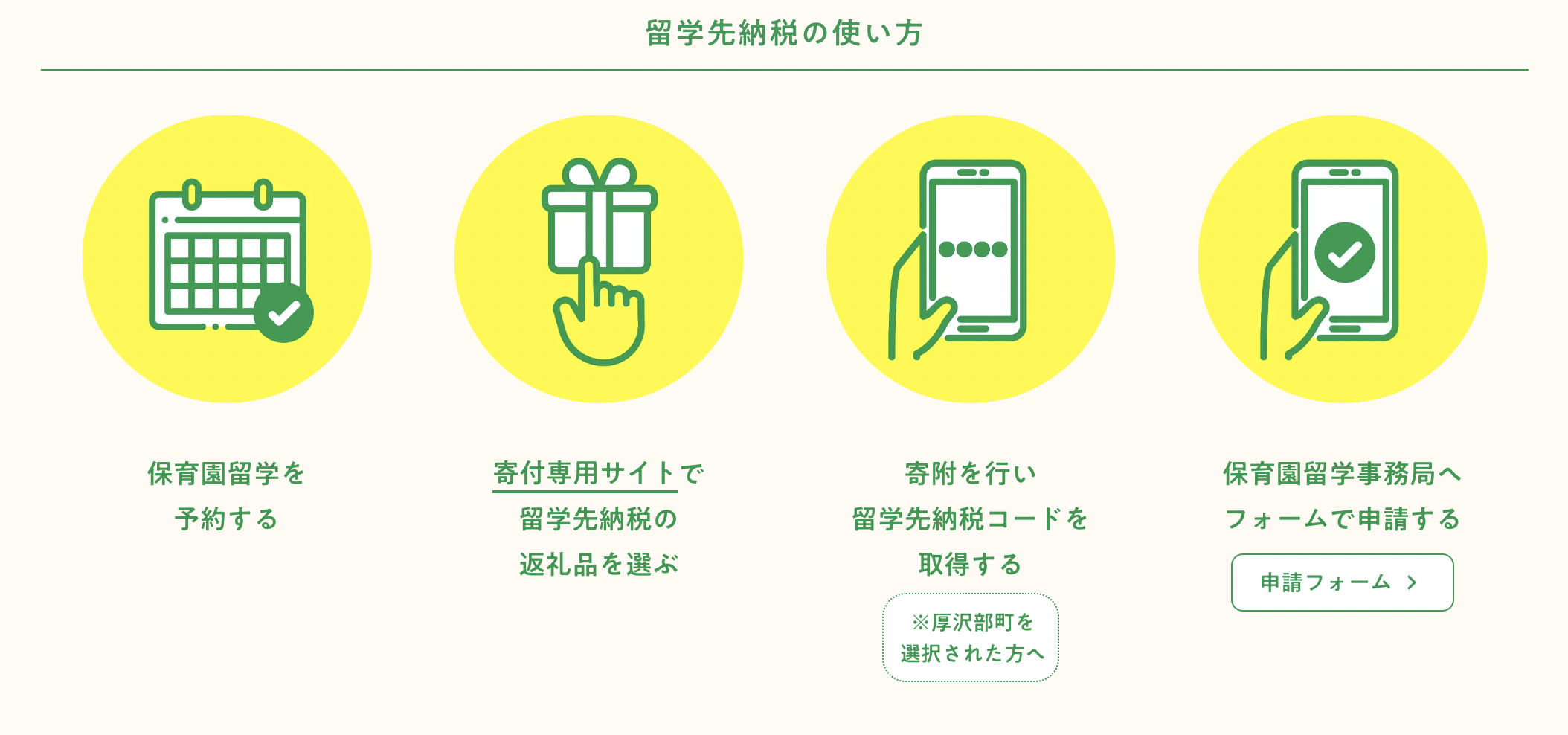 ご家族はふるさと納税で留学費用負担を減らして留学をすることができるため、保育園留学が利用検討しやすくなるほか、留学地域への応援行動としての納税も可能となり、リピート率向上にもつながります。