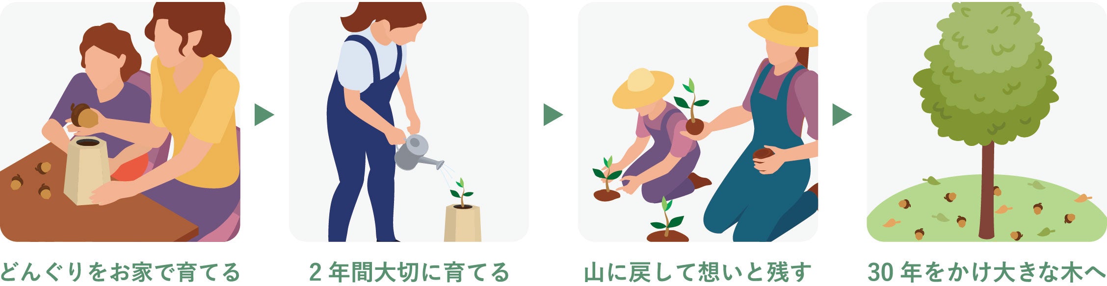 代表的な取り組みの1つが、「MODRINAE(以下、戻り苗)」です。どんぐりの苗木を家庭で育て当社に送っていただくと、当社が山に植えて森林の保全に繋げていく…そんな森づくりのサイクルを生む観葉植物です。