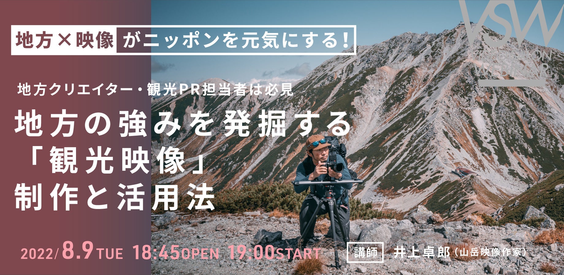 地元長野県を拠点に雄大な山岳動画を撮影し続ける井上卓郎さんが講師を務めます。さまざまな観光映像も手掛ける井上さんが、観光映像の悩みをスパッと解決します。「観光映像に欠かせないノウハウは何か」「どうやって観光映像を仕事にするのか」というクリエーターはもちろん、「観光映像をどう活用したらいいか分からない」「そもそも誰にどうやって製作依頼をしたらいいのか分からない」という観光地のプロモーション担当者も必見。