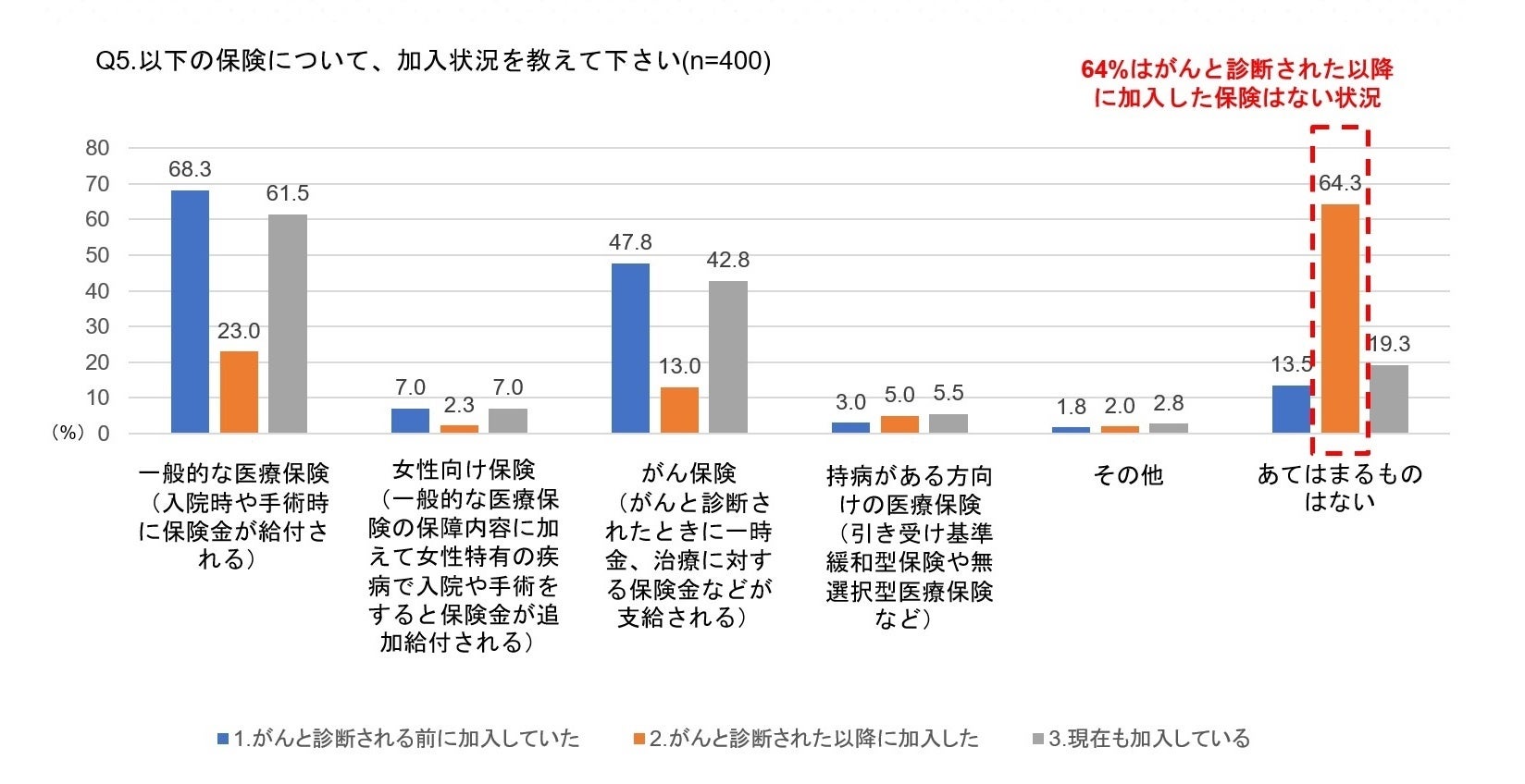 実際に当社がオンラインで実施した調査では、「がんと診断された後に新たに保険に加入してみたいと思ったことがある」人は約8割と、多くの方が健康への備えとして新たな保険への加入を考えたことがあると答えていますが、がん経験者の7割強が「一度がんに罹患すると、新たに医療保険に入るのが難しい」と感じたことがあることが分かりました。また、実際がんと診断された後に保険加入を検討した人のうち、7割以上が「自分の健康状態が保険の加入条件に満たなかった」、または「保険料が高い」という理由で加入を断念していました。(調査結果は本文下部に詳細を記載)