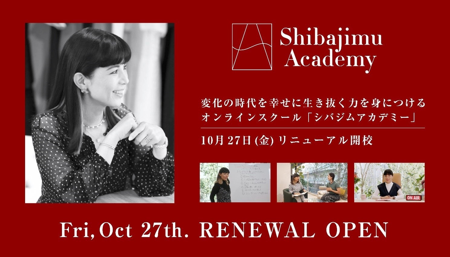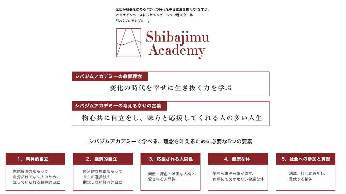 事業構想が始まった3年前はコロナなどの影響もあり、ライフスタイルや働き方もますます多様化し、柴田がこれまでたくさんの学びや気づきを得た現場学習の機会は極端に少なくなりました。また、直接的なコミュニケーションを通じての成長の機会も減り、社会環境が大きく変わろうとしている変化の時代を迎えました。この変化の時代をその人らしく生き生きと、仕事も個人の生活も充実させられる人が増えるよう、2021年11月、柴田が校長を務める「変化の時代を幸せに生き抜く力を持つ人の育成」を目指したオンラインスクール「Shibajimu Academy(以下、シバジムアカデミー)」を開校しました。開校から約1年半、1,000名を超える方に受講いただき、3期目を迎えるにあたり、シバジムアカデミーの理念をもっと多くの方に届けたい。人生100年時代を生き抜く力を一人でも多くの人に身に付けていただき、“物心共に自立をし、味方と応援してくれる人の多い人生” を歩んでいただくためのお手伝いが出来たらと思い、この度、新たなサービスとしてリニューアルすることになりました。