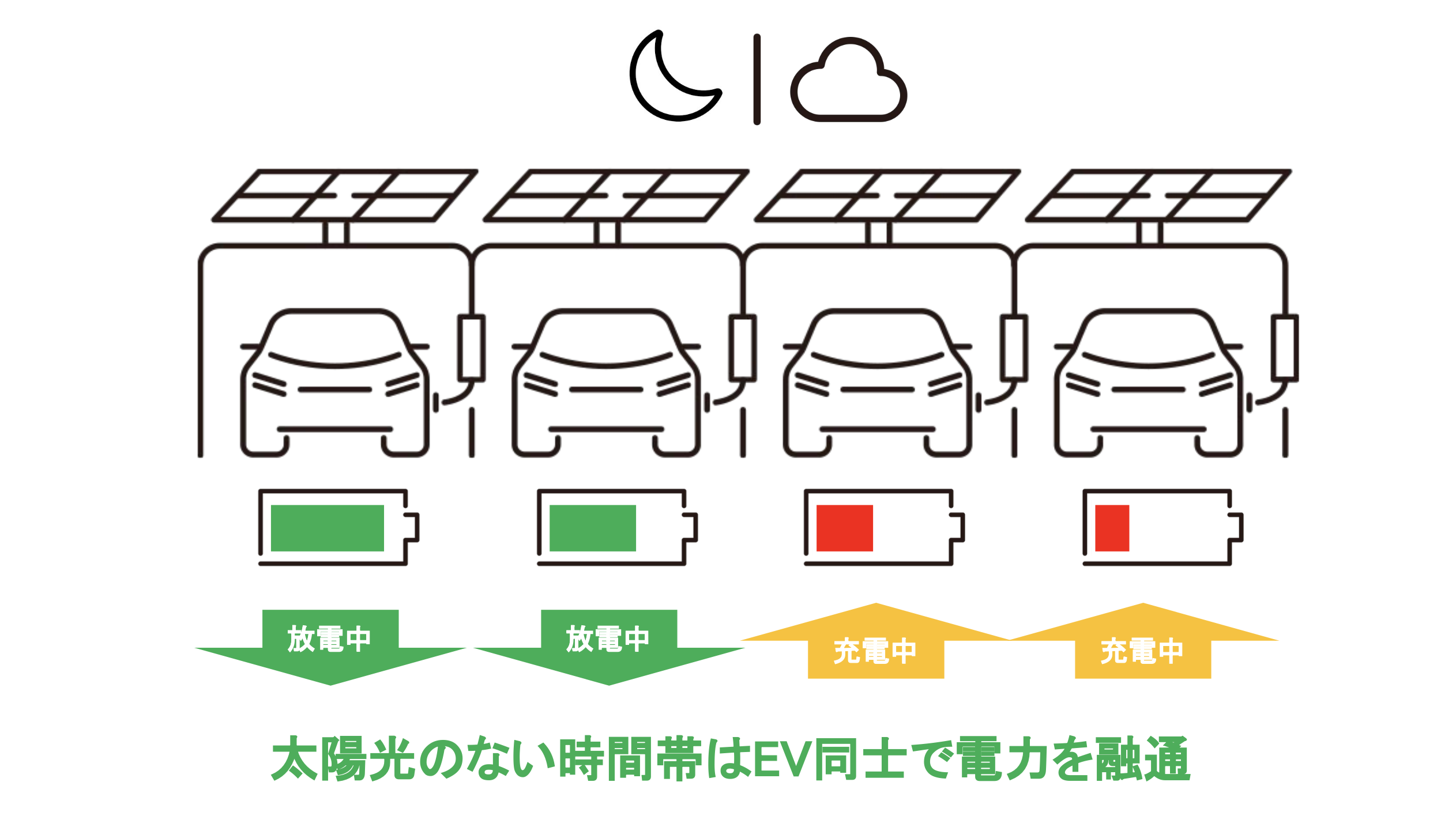 YaneBoxは一基で複数台のEVを充放電できるだけでなく、EVを太陽光発電の直流電力で充電することが可能なV2X※機器です。本実証実験ではYaneBoxに複数台のEVを接続し、そこから隣接する普通充電コンセントに繋がるEVに給電することで、定置型蓄電池を使用せずにオフグリッド充電システムを実現することを目指します。このV2V(Vehicle to Vehicle)システムは、定置型蓄電池よりもkWh単価が安いEVのバッテリーを最大限活用することで、従来のオフグリッド充電システムのコスト面の課題を克服することが期待されます。