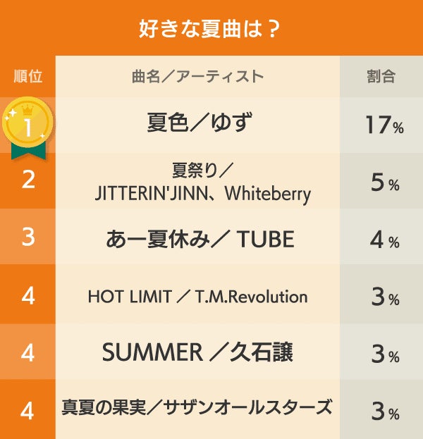 第1位『夏色(ゆず)』17%、第2位『夏祭り(JITTERIN’JINN/Whiteberry)』5%、第3位『あー夏休み(TUBE)』4%
