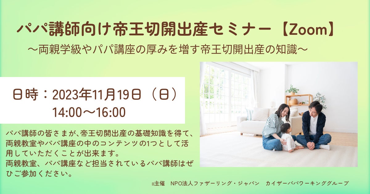 日本では約4〜5組に1組が帝王切開出産です。当日に緊急で実施される可能性もあり、全てのパパママが帝王切開出産について知っておくことが望ましいです。パパ講師が帝王切開出産の基礎知識とママのサポート方法について学び、両親教室やパパ講座で活用いただける実践的なセミナーです。ぜひ多くのパパ講師のご参加をお待ちしています。