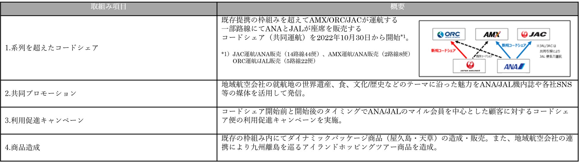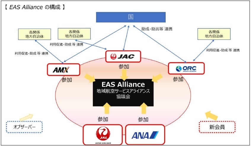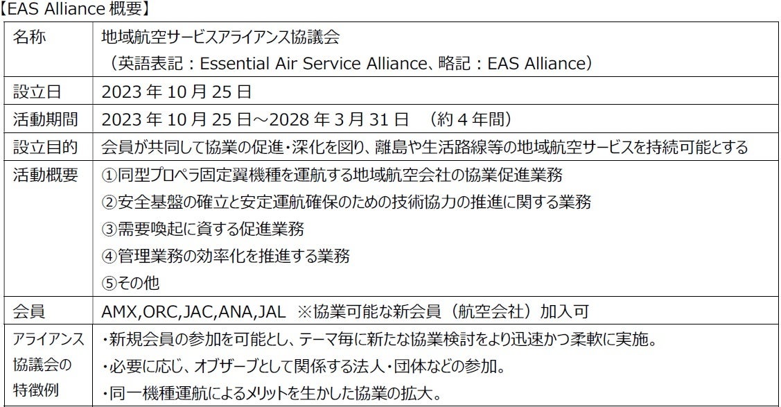 天草エアライン株式会社(本社:熊本県天草市、代表取締役社長:永岡 真、以下「AMX」)、オリエンタルエアブリッジ株式会社(本社:長崎県大村市、代表取締役社長:大人形 綱邦、以下「ORC」)、日本エアコミューター株式会社(本社:鹿児島県霧島市、代表取締役社長:武井 真剛、以下「JAC」)、全日本空輸株式会社(本社:東京都港区、代表取締役社長:井上 慎一、以下「ANA」)、日本航空株式会社(本社:東京都品川区、代表取締役社長:赤坂 祐二、以下「JAL」)の5社は、本日、「地域航空サービスアライアンス協議会(以下「EAS Alliance」)」を設立しました。