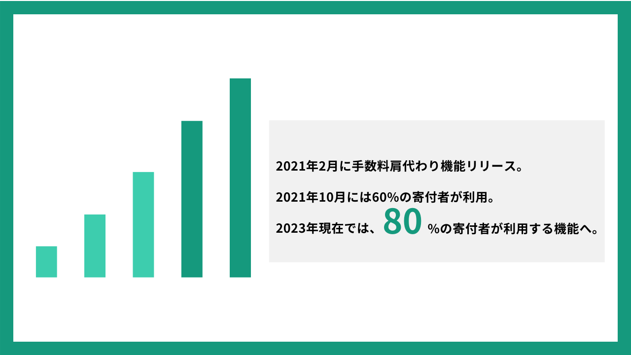 Syncableは、2021年2月より決済手数料を寄付者が肩代わり機能の提供を開始いたしました。利用率60%であった2021年から、2023年現在において、80%の寄付者の皆様にご利用いただけるまでになりました(※単発寄付に限定して算出)。