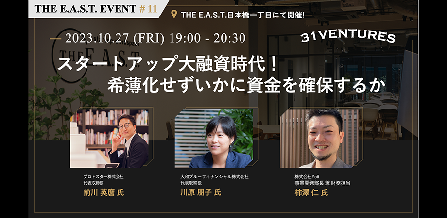 今回は、プロトスター株式会社の代表取締役社長である前川がモデレーターとなり、株式会社Yoii 事業開発部長 兼 財務担当 柿澤仁氏、大和ブルーフィナンシャル株式会社 代表取締役 川原朋子氏を迎え、「スタートアップの資金確保と成長」をテーマに話を伺います。