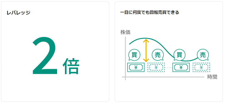 米国株信用取引は、米国株式や現金(米ドル、日本円)を担保に評価額*2の2倍の金額まで売買することができます。また、現物取引では、1日に同じ資金で取引できるのは「買→売」の1回のみですが、信用取引であれば、何度でも売買することができます。資金効率が大幅に上がりますので、取引のチャンスを逃しません*3。