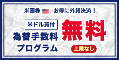 米ドル買いの為替手数料が、通常1米ドルあたり25銭のところ0銭となるプログラムです。米ドル買数量に上限はなく、エントリーも不要で、どなたでも対象となります。米国株信用取引とあわせて、ご利用ください。
