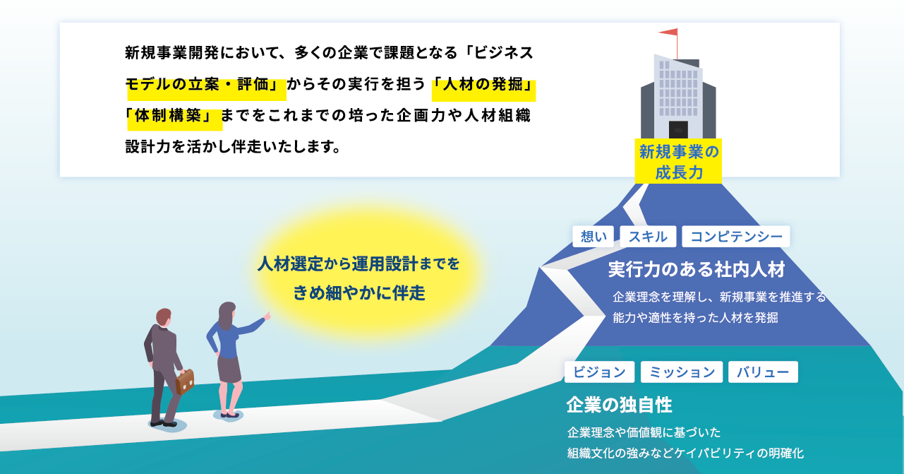 「新規事業創出サービス」によって、新規事業開発に必要な人材面と経営戦略面をサポートすることで、社内での新規事業の立上げが可能です。