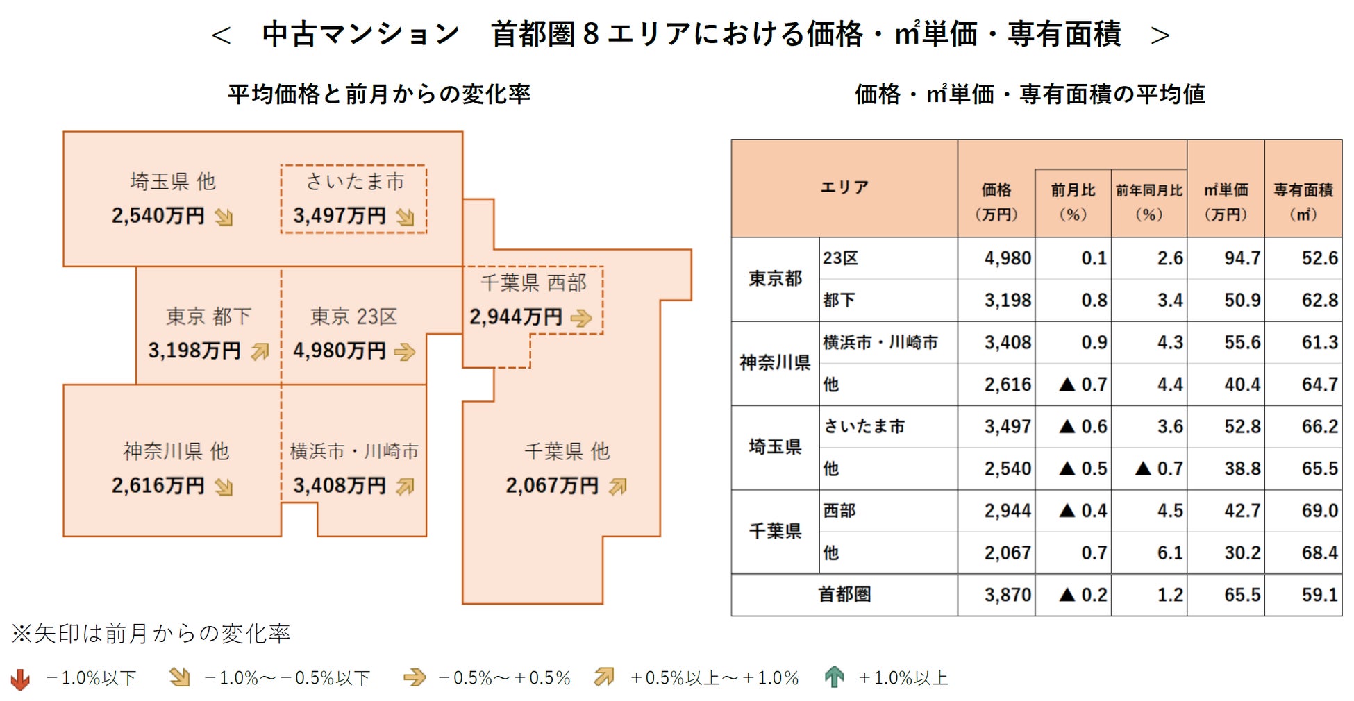 首都圏の中古マンション1戸あたり平均価格は3,870万円で、前月比-0.2%と5カ月連続で下落。