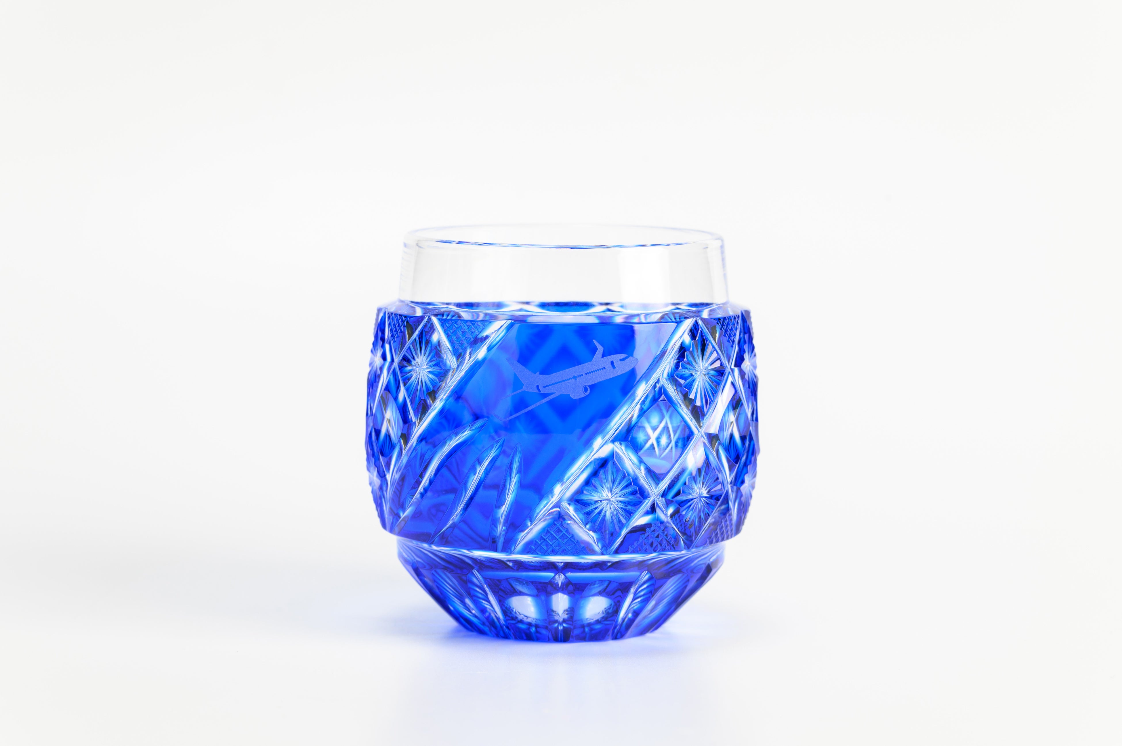 このグラスを使うたびに、大空を旅しているような特別な気分になってほしいという思いでデザインされた特別な薩摩切子。カラーは青空をイメージしたブルー。グラスの表面には、飛行機以外に飛行機雲や雲が流れるイメージを、薩摩切子伝統の技「カット(切子)」などで表現。丸グラスはワインなど香りを楽しみたい飲み物などにおすすめの逸品。