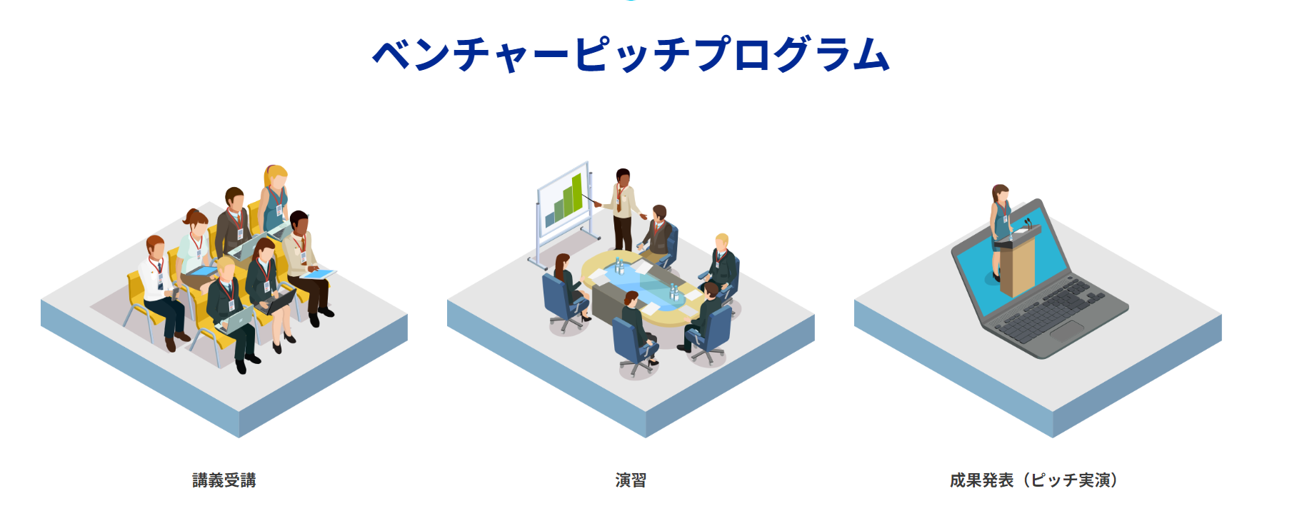 本コースでは、コーチングによりビジネスプランのブラッシュアップを行い、新規事業となる製品・サービスの開発をサポートします。成果発表は、ピッチイベントを開催し、VC、CVCなどの投資家に対し、アピールを行っていただきます。