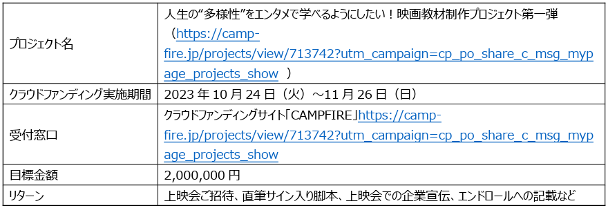社会課題解決に向けビジネス的アプローチを試みる・むちのち株式会社(本社:東京都千代田区、代表:大神千朋)は、人生の多様性を映画を通じて知る・考えるきっかけを作る、「エンターテインメント型教材」という新しい教材の形へ挑むべく、「人生の“多様性”をエンタメで学べるようにしたい!映画教材制作プロジェクト」を発足し、その運営資金をクラウドファンディングサイト「CAMPFIRE」にて募集を開始しました。募集期間は2023年10月24日(火)から11月26日(日)で、募集金額は200万円を目指します。URL:https://camp-fire.jp/projects/view/713742