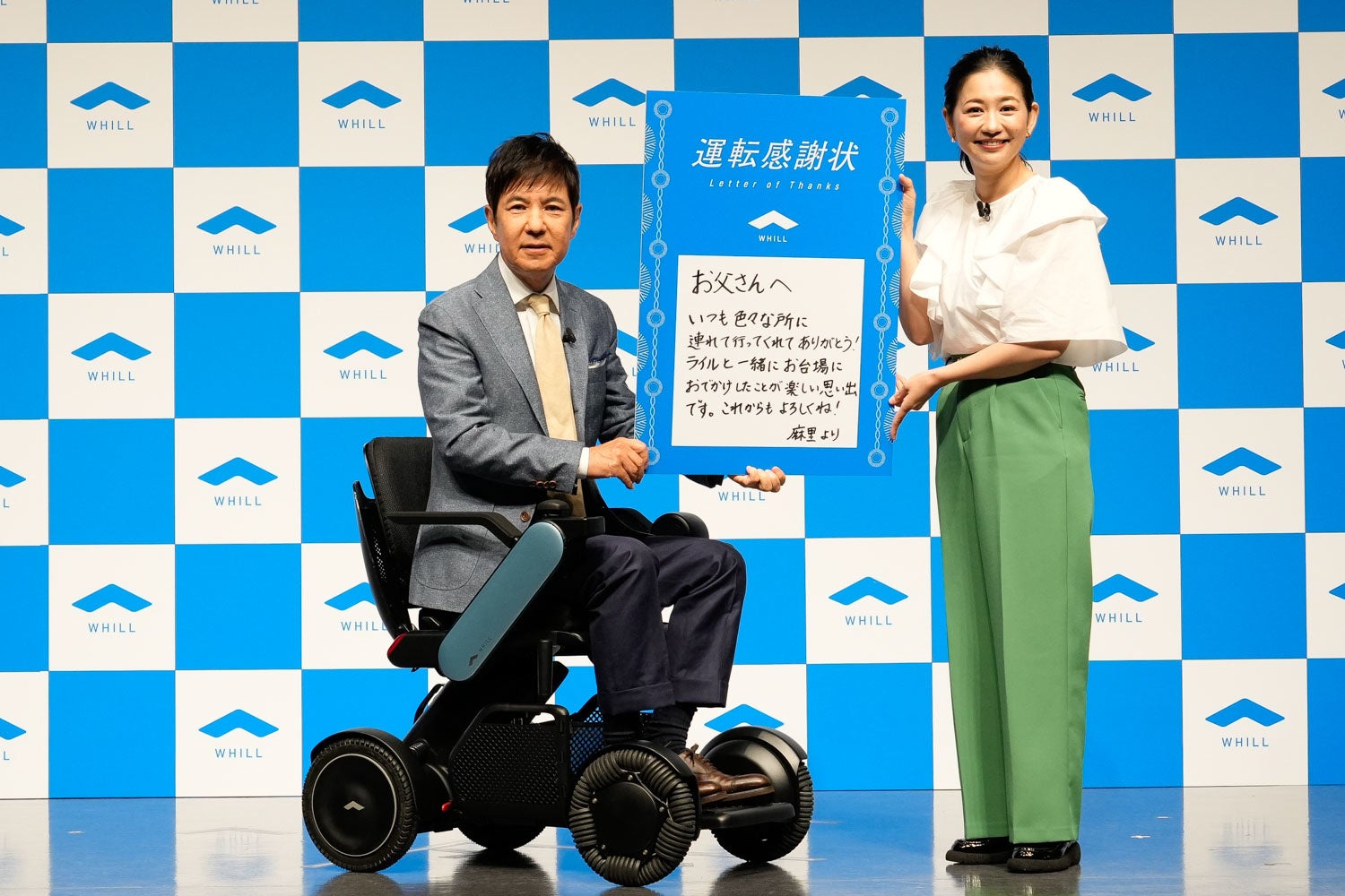 イベントでは、クルマ好きとしても知られるタレントの関根勤さんと娘の麻里さんが登場し、免許返納やこれからの移動について親子で考えるトークセッションを行いました。勤さんは免許返納について「運転の中で、ヒヤッとするようなタイミングが増えてきたら、家族のためにいつでも運転を辞めるつもりです。」と家族思いな自身の見解をコメントしました。また、トークセッションの後には麻里さんから勤さんに、サプライズでWHILLのプレゼントと、今までドライブで家族をさまざまな場所へ連れて行ってくれた感謝の気持ちを込めた運転感謝状の贈呈も行われました。勤さんは麻里さんからのサプライズに「恥ずかしからずに感謝の気持ちを伝えてくれて素直に嬉しい」と笑顔を見せていました。