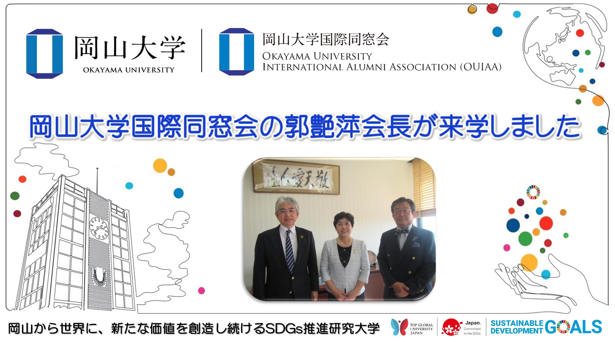 2023年10月19日、岡山大学国際同窓会の郭艶萍会長が来学し、那須保友学長を表敬訪問しました。今回の訪問は、郭会長が第13回岡山大学国際同窓会総会への出席のために来日し、実現しました。
