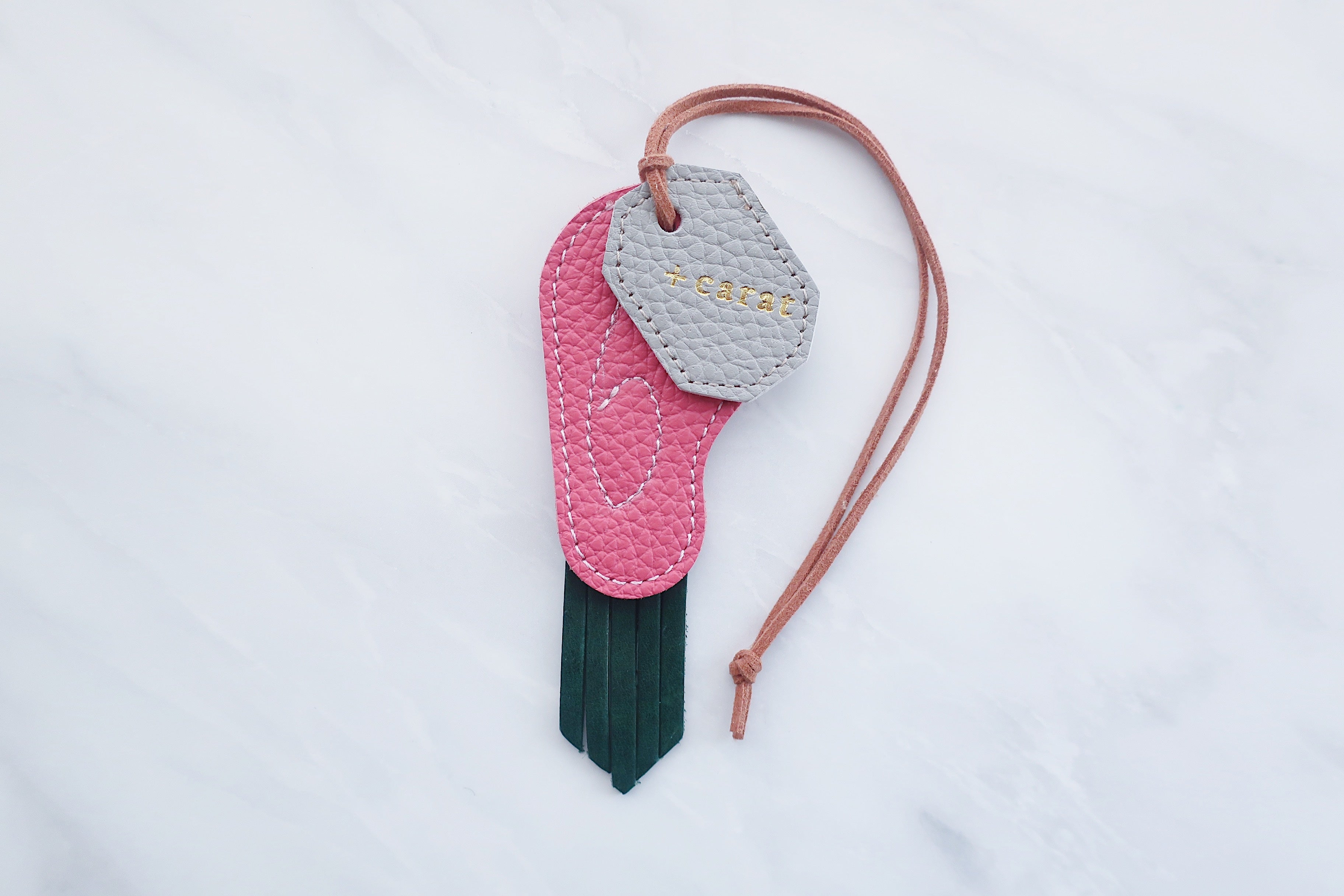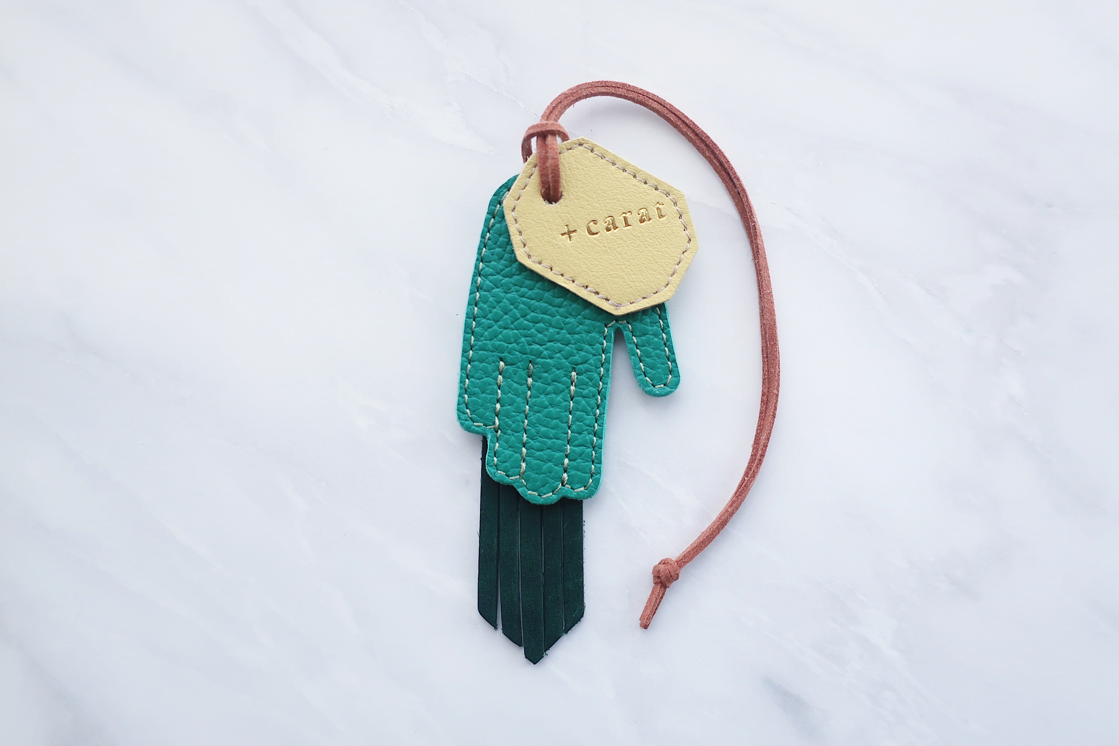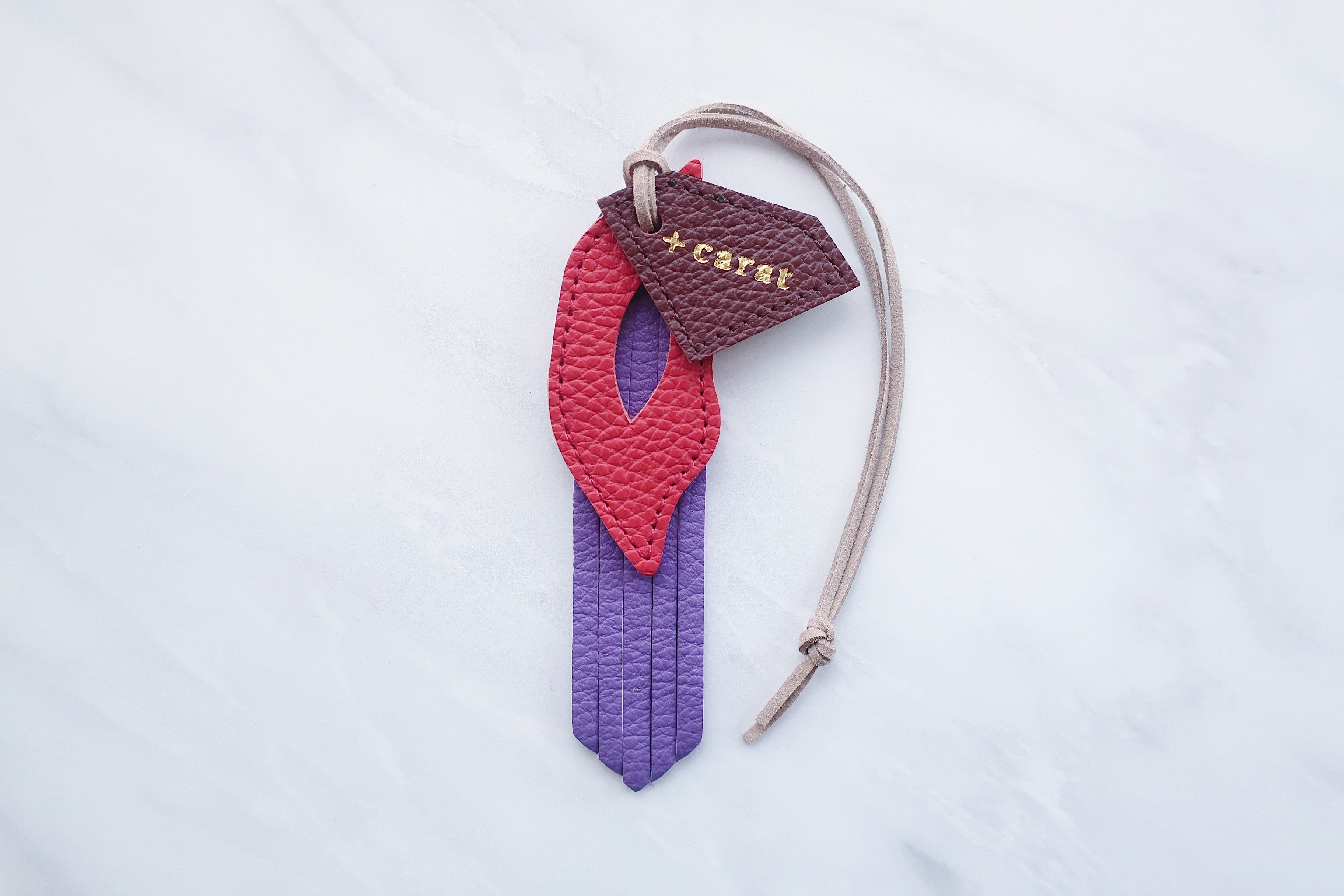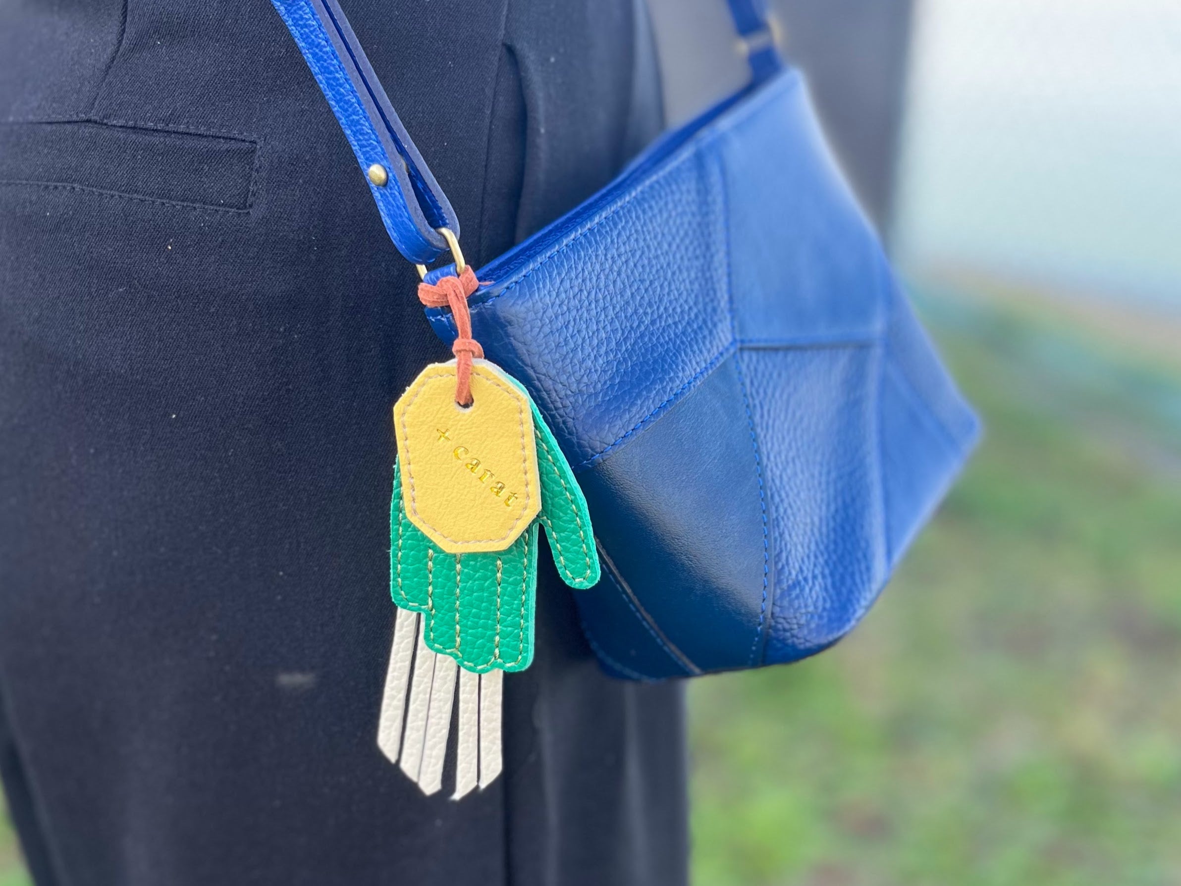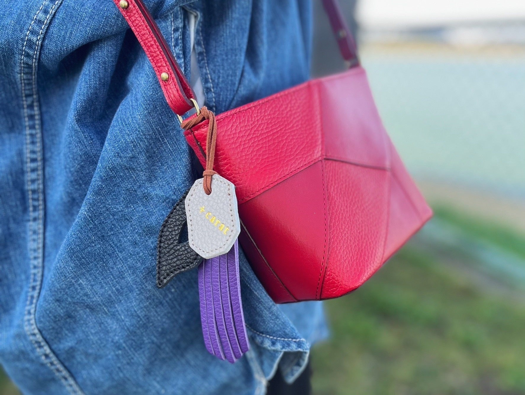 ブランドコンセプトである“宝石をまとう”を形にしたバッグチャームです。この商品は、革製品の製造過程で捨てられる小さな残革や使われなくなった端材を救いたいという思いから生まれました。