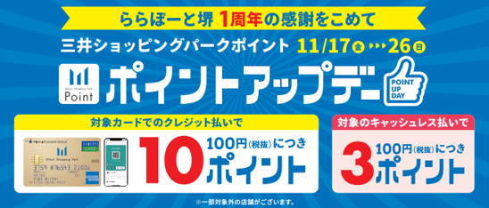 ららぽーと堺1周年の感謝を込めて対象カードのクレジット払いで100円につき通常2ポイントのところ10ポイントのポイントアップ!