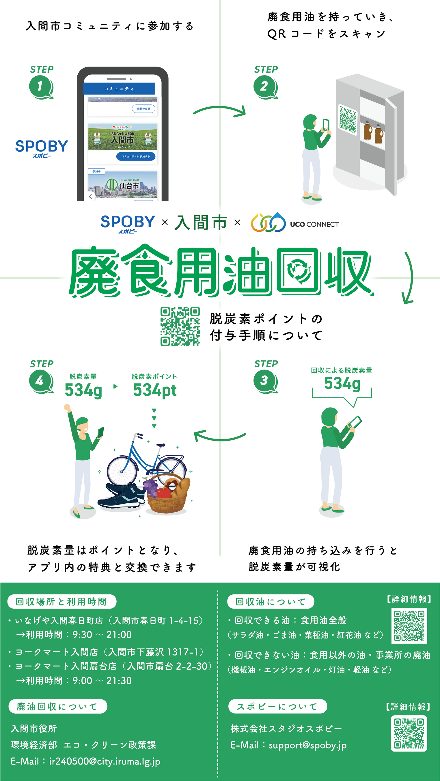 更に、2023年10月28日(土)・29日(日)の入間万燈まつり限定で、UCO CONNECT株式会社と連携し、家庭の使用済み油(廃食油)の回収・リサイクルをポイント化する実証実験を実施します。