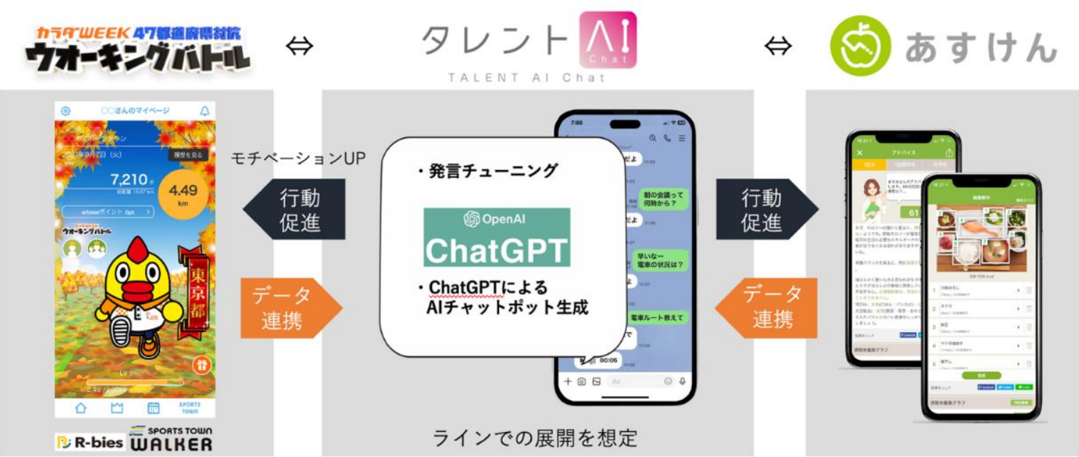 また、食事管理アプリ「あすけん」とデータ連携し、参加者がより健康的な生活ができるよう「AIおーじくん」がLINE上で参加者それぞれに合わせた応援をしてくれます。この機会に「タレントAI Chat」での新しいコミュニケーションを体験ください。