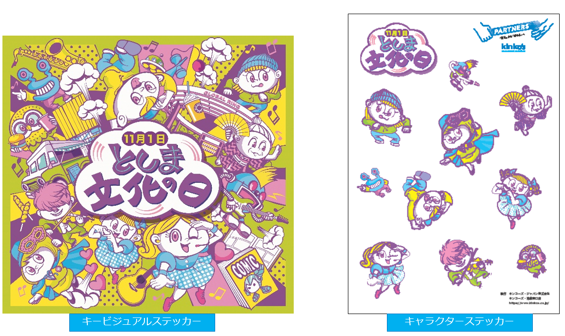 豊島区では、11月1日「としま文化の日」に合わせて、2023年11月1日(水)~11月7日(火)の推進期間にさまざまなイベントが開催されます。ストリートカルチャー、アーバンスポーツ、マンガ・アニメ・コスプレ、音楽など子どもから大人まで誰もが楽しめるイベントが盛りだくさん! 当社は、キービジュアルステッカーとキャラクターステッカーを提供します。(画像)