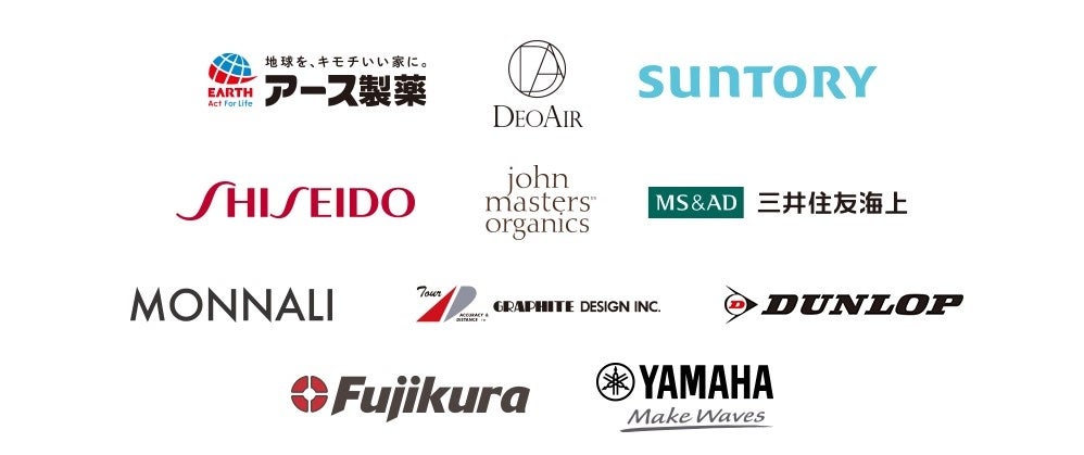 アース製薬株式会社、株式会社Cleair、サントリーホールディングス株式会社、株式会社資生堂、株式会社ジョンマスターオーガニックグループ、三井住友海上火災保険株式会社、株式会社モナリ、株式会社グラファイトデザイン、株式会社ダンロップスポーツマーケティング、藤倉コンポジット株式会社、ヤマハ株式会社