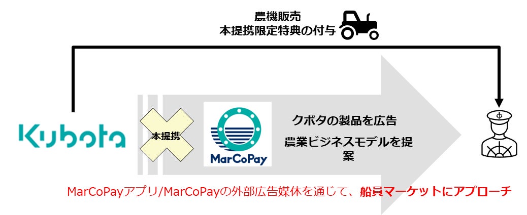 「MarCoPay」アプリ上やマルコペイ社の外部媒体で、船員向けにクボタの農機の広告を掲載します。