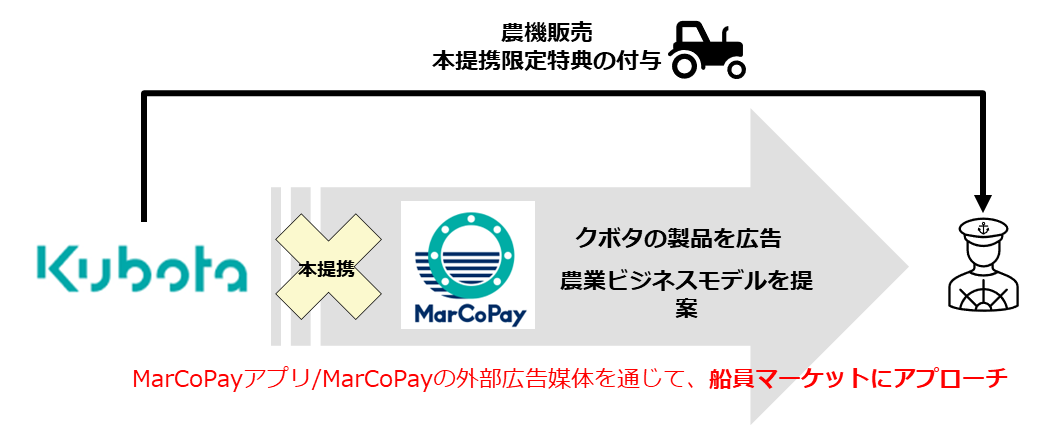 「MarCoPay」アプリ上やマルコペイ社の外部媒体で、船員向けにクボタの農機の広告を掲載します。